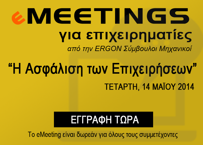 H ERGON Σύμβουλοι Μηχανικοί διοργανώνει δωρεάν διαδικτυακή ενημερωτική συνάντηση (eMeeting) για επιχειρηματίες, με κεντρικό θέμα: «Η Ασφάλιση των Επιχειρήσεων». Το eMeeting θα πραγματοποιηθεί την Τετάρτη 14 Μαΐου 2014 στις 21:00.
